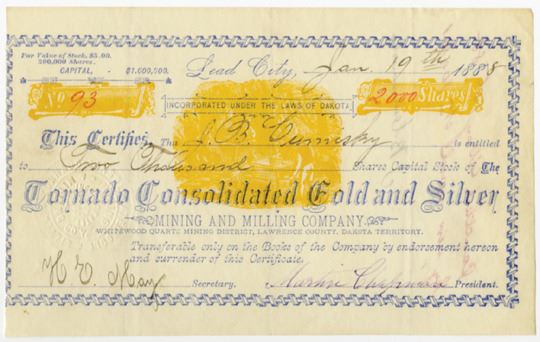 Lead City, Dakota Territory. 1888. 2,000 Shares I/C Capital Stock Certificate S/N 93, Blue text with blue border, orange undertints. VF condition with left margin slightly cut off. The mine was located in the Whitewood Quartz Mining District, Lawrence County, Dakota Territory.
