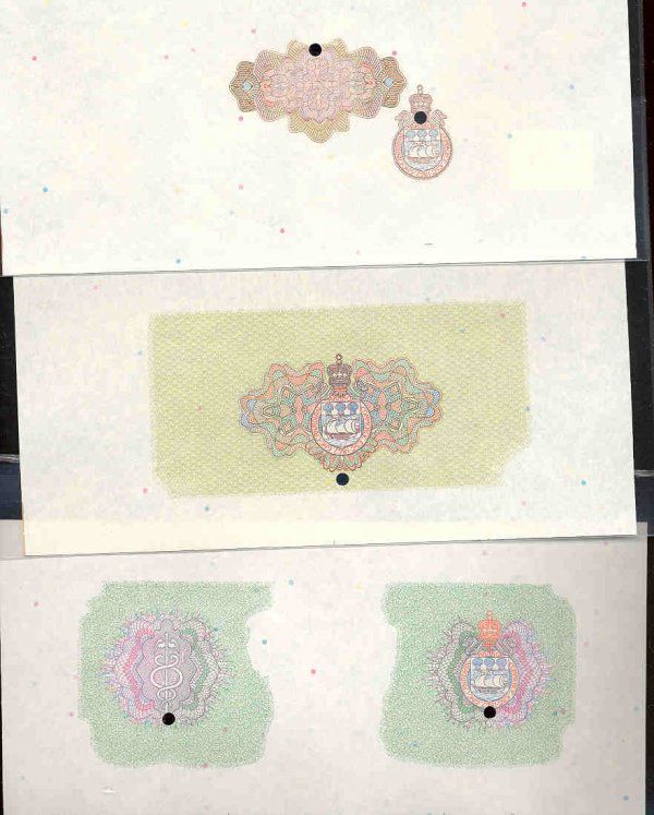 1917. P-S965A; S968A; S969. $5; $50; $100 3 different undertint and cycloid tint proof designs in issued colors. Printed on banknote paper. Backs are blank. Choice Unc. Rare undertint proofs from this popular issue. ABNC.