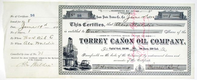 California, 1894. 1 Share I/C Capital Stock Certificate, S/N 16, Black text with black border, Oil platform depicted at bottom left corner. Cancelled in ink, Fine condition, Printed by Crocker & Co. Signed by Thomas R. Bard as company president. Thomas Robert Bard (December 8, 1841 _ March 5, 1915) was a political leader in California who assisted in the organization of Ventura County and represented the state in the United States Senate from 1900 to 1905 as a Republican. In 1867, Bard became the first person in California to produce oil from a drilled well. He is known as the "Father of Port Hueneme" for his efforts in building and expanding the city, as well as the first and only deep water port in the area. He is one of the founders of the UNOCAL company, and held profitable interests in several oil companies.