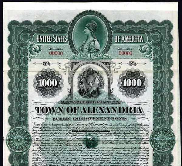 Louisiana. 1900. $1000 5% Specimen Bond with coupons attached. Black print with green border and underprint. Vignette of state seal center. VF condition. ABNC.