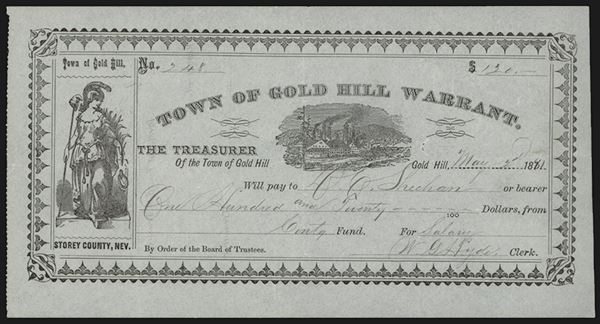 Gold Hill, Storey County, Nevada, 1881. $120, Issued Warrant or check for County Fund, Possibly a circulating check since it was payable to Sheehan or "Bearer", black with no underprint, allegorical Liberty on left with mines and smelters in middle, XF condition. Attractive and scarce Gold Hill Nevada mining town warrant.