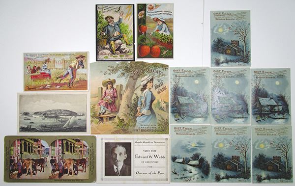 Various Locations. Lot of 14 items related to consumer product advertisements, highlights include: Whittemore Bros. & Co., Gilt Edge in Large Bottles; Nevills & McWatters, Hennings Health Preserving Corset; William Broadhead & Sons, "Broadmead" Dress Goods; and an advertisement for Edward W. Webb's campaign for Regular Republican Nomination of Greenpoint; a Manhattan Beach-Coney Island trade card ca.18890's with Steamship schedule on back; 1900-20, Key West, Florida, Stereo-photo card "Delivering Fresh Milk, Key West"; and other trade cards, Mostly Fine to XF. (14).