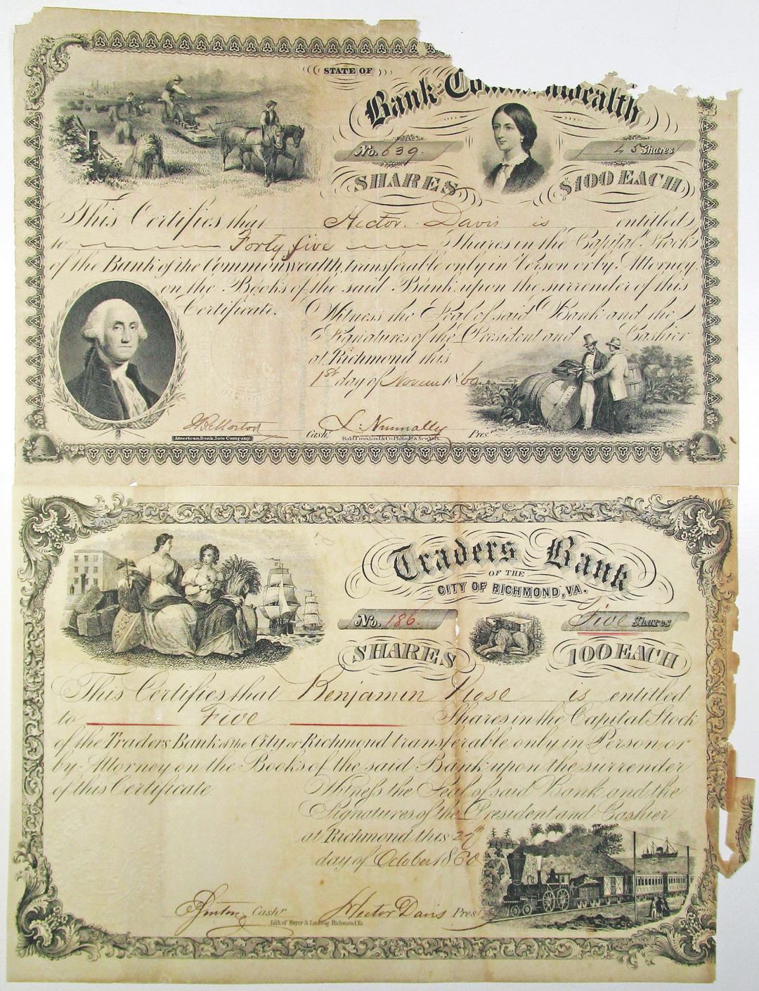 Richmond, Virginia. Lot includes 2 pieces, both dated 1860, Includes: Traders Bank of the City of Richmond, VA., 1860, 5 Shares I/U Capital Stock Certificate in black, Fine condition but the right border has paper loss going into design and toning, Lith of Hoyer & Ludwig, Richmond, VA.; and Bank of the Commonwealth, 1860, 45 Shares I/U Capital Stock Certificate in black, fine condition but missing a 4 inch triangular piece from the upper right corner, printed by BC&C, Philadelphia. (2)