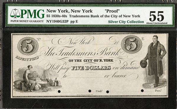 Tradesmen's Bank ca.1830's Obsolete Proof. New York, NY, 18xx (ca.1830's), $5, Plate E, NY-1940-G32, Proof banknote, black on india paper, Lafayette on right, seated allegorical Justice at dock with sailing ship and cargo to right. POC's, PMG graded About Uncirculated 55 condition. Durand, Perkins & Co., New York imprint. Known only in proof. (resilver City Collection, AIA Sale VIII, Lot 1195).