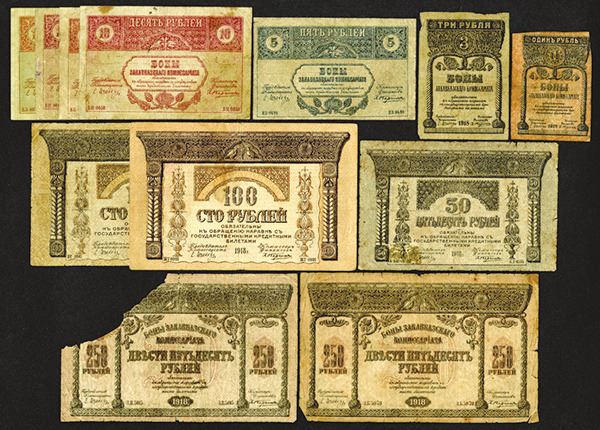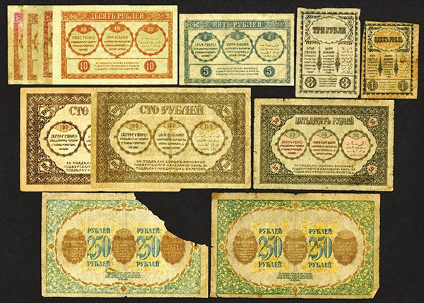 Russia 1 Ruble P-S601 VG, 3 Rubles P-S602 VG, 5 Rubles P-S603 Fine, 10 Rubles P-S604 (4 pcs.) Good - Fine, 50 Rubles P-S605 VG, 100 Rubles P-S606 (2 varieties) Fine, 250 Rubles P-S607 (2 pcs.) VG & torn. Interesting group of 12 notes.