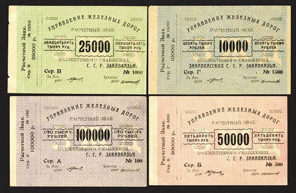 Russia (SSRR), Lot of 4 notes, Includes 10,000; 25,000; 50,000; 100,000 Rubles, P-S642 to S645, Uncirculated. Attractive set missing only the low value. (The Pogrebetsky Family Archives)