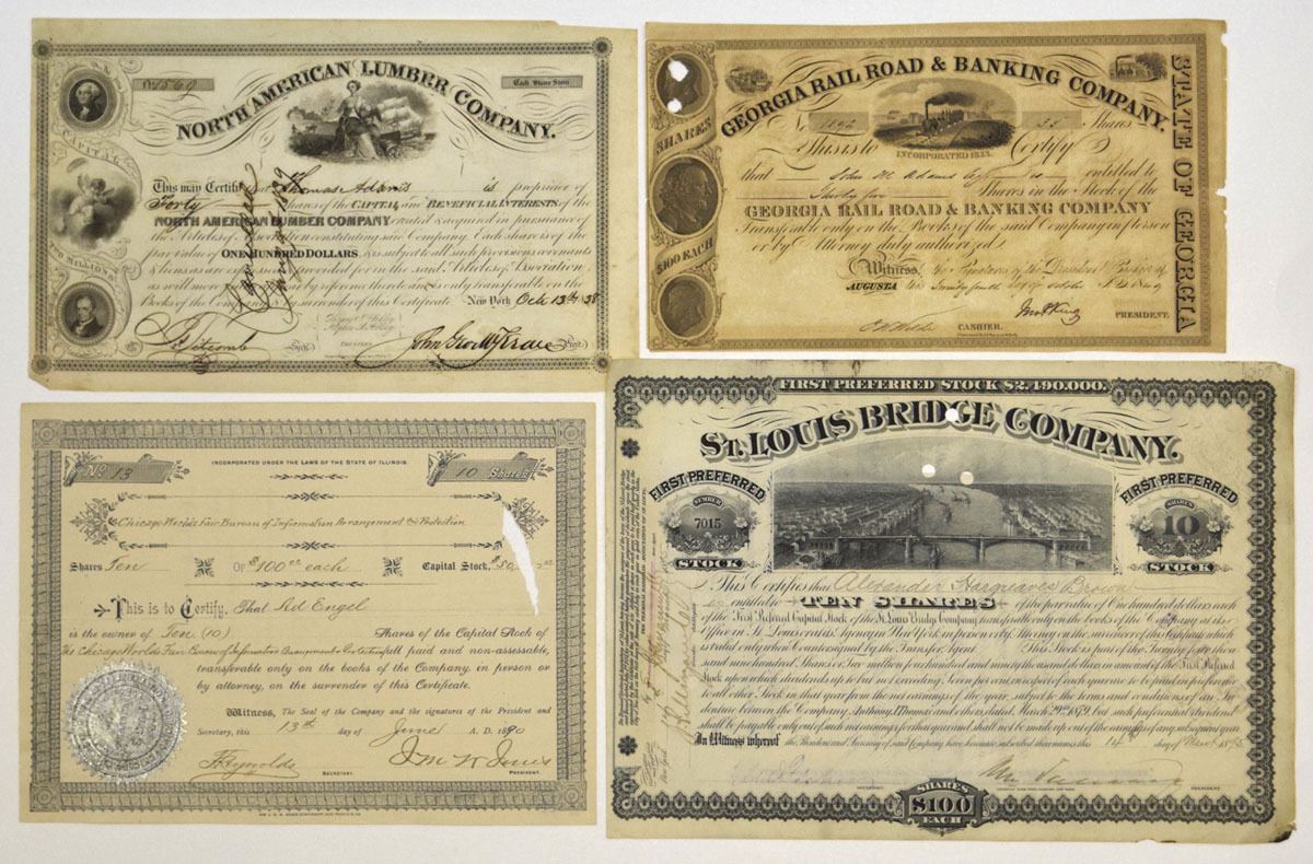 Various States......., Lot of 4 stock certificates representing early American transportation, banking, lumber, and infrastructure enterprises. Includes North American Lumber Co.; Georgia Rail Road & Banking Co.; Chicago World’s Fair Bureau of Information, Arrangement & Protection; and St. Louis Bridge Co. Conditions range from Fair to Very Fine overall, with expected age wear including folds, edge wear, light toning, scattered stains, and small paper losses; one shows punch or cancellation holes. (4). Sold “AS IS” no returns accepted.