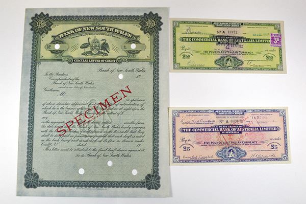 Australia. Bank of New South Wales. 4-page Circular letter of Credit. Overprint in red: SPECIMEN. Waterlow & Sons imprint. POCs. Choice Uncirculated; Commercial Bank of Australia Ltd. 5, 10 Pounds Traveler's check, the latter with 3d duty tax stamp. Both 1962. Issued and cancelled. Both EF. 3 pieces.