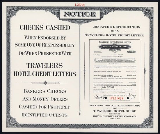 New York, 19xx (ca.1900-1920), Litho for The Hotel Letter Credit Co encouraging hotels to honor their service of providing travelers with a Òletter of creditÓ basically guaranteeing the hotel won't suffer a loss on a check presented by a guest enrolled with them, Red SPECIMEN hand stamp and two security punches, XF condition, ABNC.