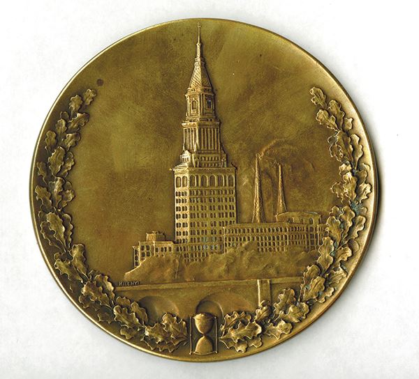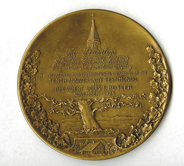Travelers Insurance Co. Testimonial 10th Anniversary Medal for Louis Butler. NYC HQ building on obverse within oak wreath. Tribute inscription on reverse. Sculpted by J. Kilenyi. Struck by Whitehead & Hoag. 100mm. Cleaned in the past, residue in some recessed areas.
