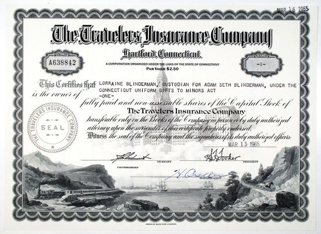 Connecticut, 1965. 1 Share I/U Capital Stock Certificate, Black text with gray border and ornate riverside scene at bottom, Building underprint at center. VF condition, ABNC. The Travelers Companies, Inc., commonly known as Travelers, is an American insurance company. It is the second-largest writer of U.S. commercial property casualty insurance, and the sixth-largest writer of U.S. personal insurance through independent agents.