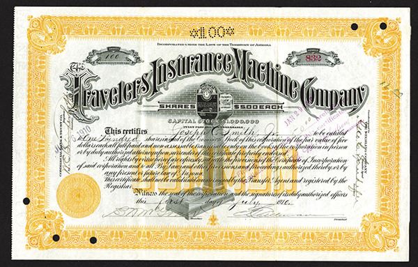 AZ. 100 Shrs Stock Certificate. Issued. Cancelled. Dissolution payout hand stamp and POCs. Great weight scale type policy issuing device vignette. VF+