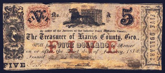 Harris County, Georgia, Oct. 21, 1862, $5, Unlisted, Issued obsolete banknote, black on red underprint, dog by safe on top middle, woman with hat on left counterfoil, S/N 284, ÒBy order of the Justices of the Inferior Court...Ó, the note is very attractive but was printed on very thin and fragile paper but appears Fine to Choice Fine condition. Scarce note in any condition.