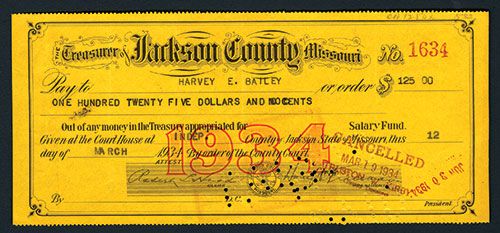 Missouri, 1934, $125, #1634, I/C, Check, Treasurer of Jackson County, Black print on orange paper with no vignette, POC's and red Cancelled stamp, Fine Condition.