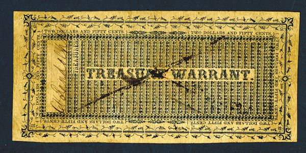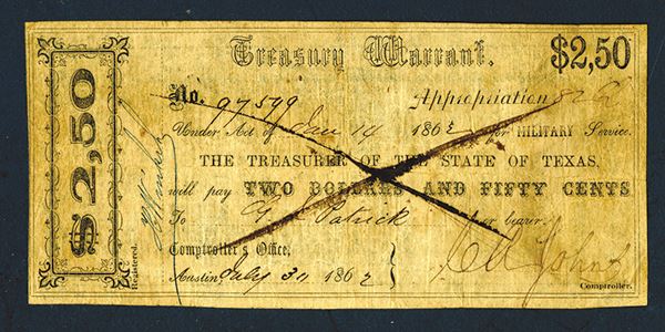 Texas. Treasury Warrant. $2.50 1862. large inked X thru face. Stain at right end. Dark paper tone. Very Good.