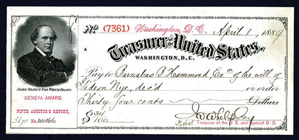 Washington, D.C., 1889, 34 Cents, Issued and Uncancelled U.S. Treasury Check Signed on the front by Assistant U.S. Treasurer J. W. Whelpley, Black on white paper with some red printed text, Salmon Chase on Left, These checks were used to disburse payments of reparations from Great Britain to the USA due to damages incurred upon Union and private shipping from Confederate Raiding Ships built by Great Britain during the Civil War. Nicely embossed AU/UNC with spindle hole. BEP.