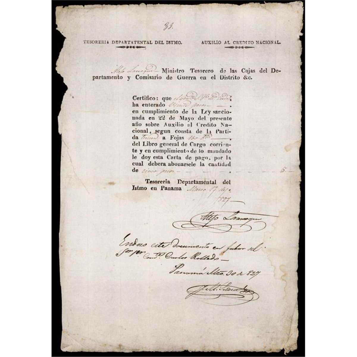 Isthmus of Panama, (Ley May 22nd), March 17, 1827, 20 Pesos, P-Unlisted, Issued by the Panama Commissioner of the Department of War and to be paid by the isthmus treasury department. Panama broke with Spain in 1821 and joined a union of Nueva Granada (Colombia), Ecuador, and Venezuela – named the Republic of Gran Colombia. When the latter dissolved in 1830, Panama and Nueva Granada stayed joined. Nueva Granada later became the Republic of Colombia. VF condition with endorsements on the bottom. Rare, historic and very early Panama and Colombia fiscal document.