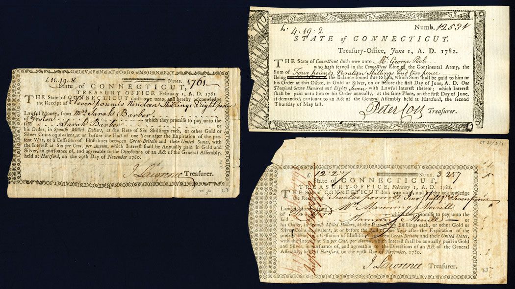 Three (3) separate notes, the first signed by Peter Colt, grandfather of the revolver maker, uncancelled and XF and the others by John Lawrence, CT 20 and 21, Fine with foxing.