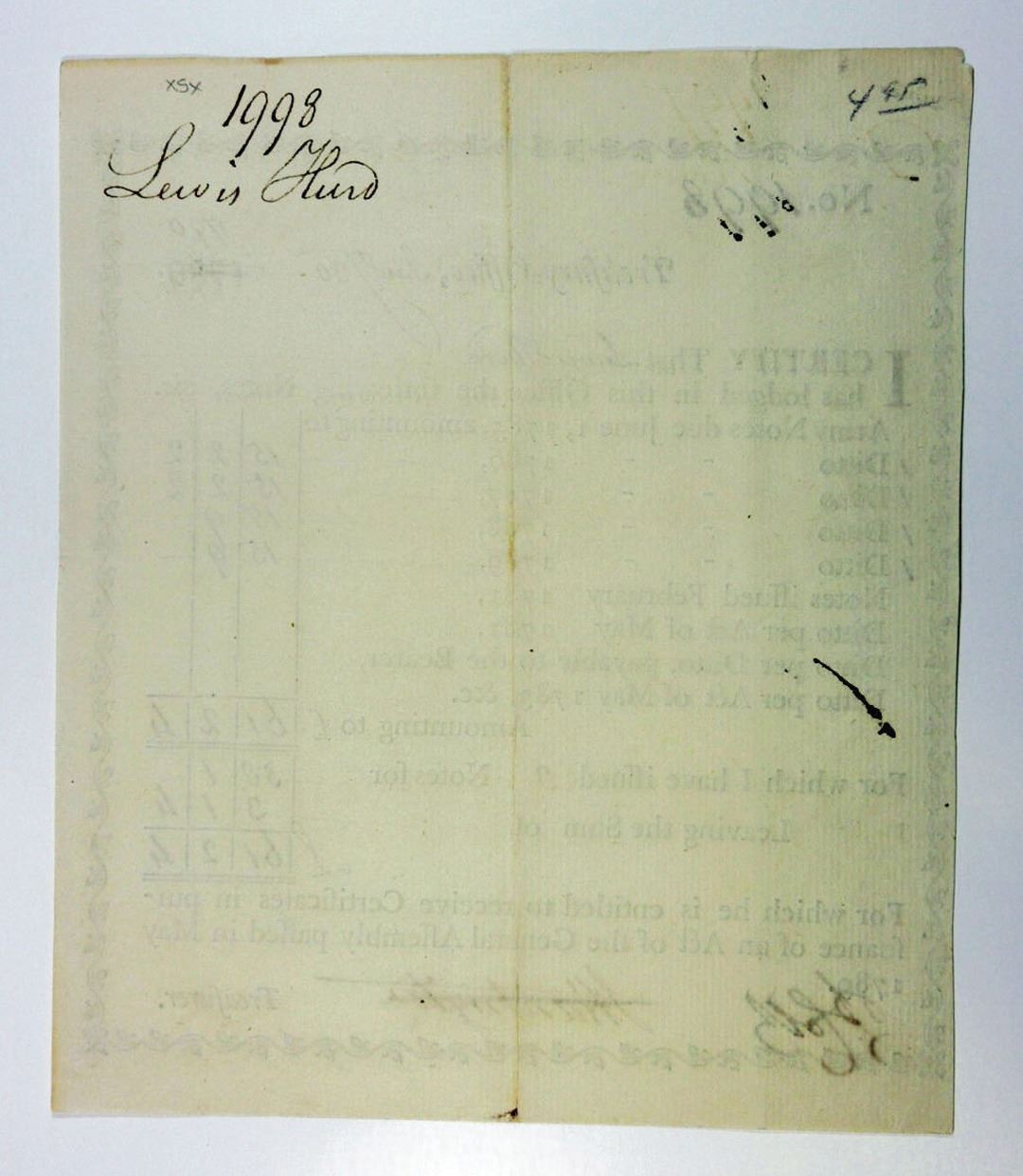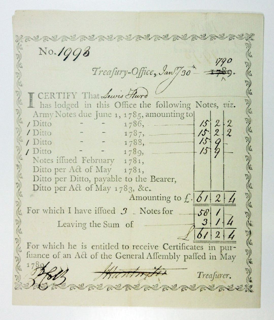 Massachusetts, 1790. Certificate from the Treasury Office detailing payment for a solider named Lewis Hurd, Signed by Colt as Treasurer with the previous treasurer Huntington crossed out, Certificate is in XF-AU condition.
