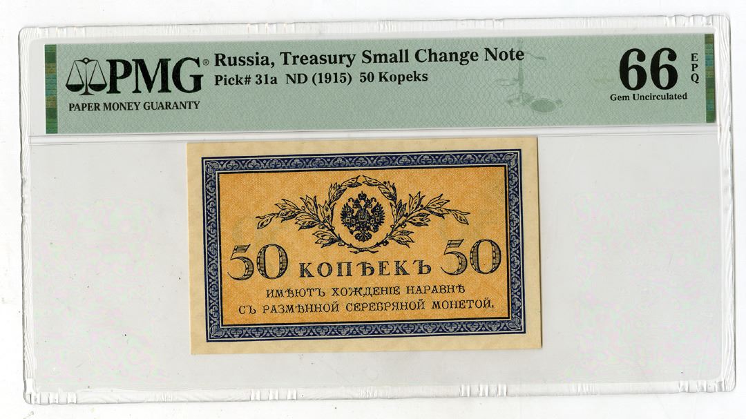 Russia, ND (1915). 50 Kopeks, P-31a, Issued Banknote, Blue on orange/brown underprint, Back is same color as front, PMG graded Gem Uncirculated 66 EPQ.