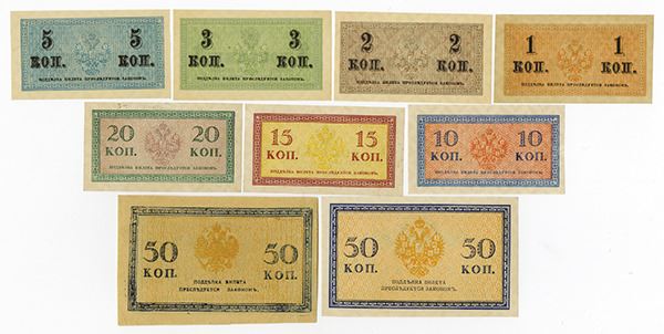 Russia, Lot of 9 notes, 1 to 50 Kopeks, P-24-31; All are Uncirculated, Highlights include P-28; 29 & 30, all Unc. To CU condition. Attractive set.