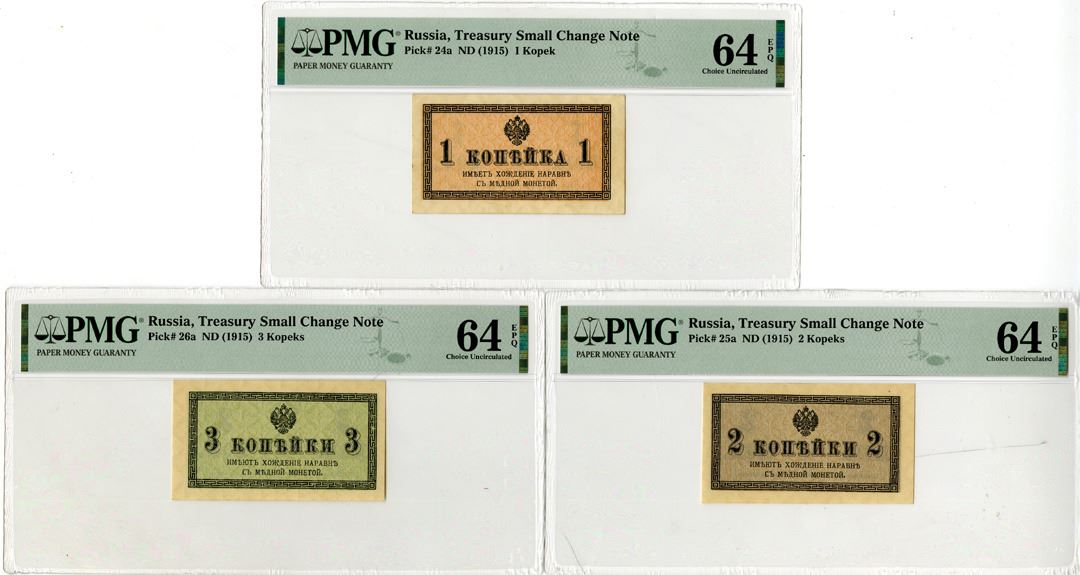 Russia, ND (1915). Lot of 3 Issued Banknotes, Includes: 1 Kopek, P-24a; 2 Kopeks, P-25a; 3 Kopeks, P-26a, All notes are PMG graded Choice Uncirculated 64 EPQ. (3).