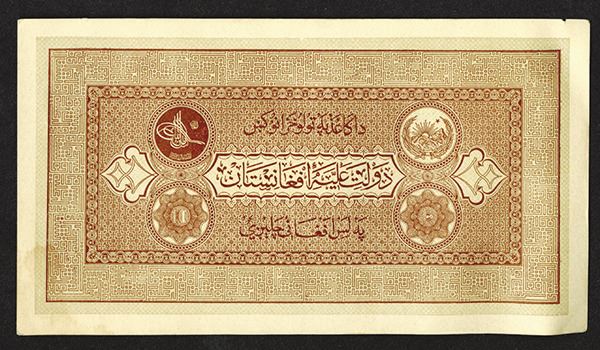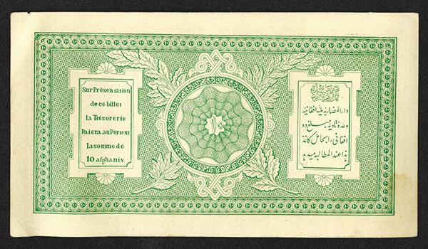 Afghanistan. 10 Afghanis. SCWPM 8. Large format. Stain at lower left, nick at upper right. Otherwise Extremely Fine.