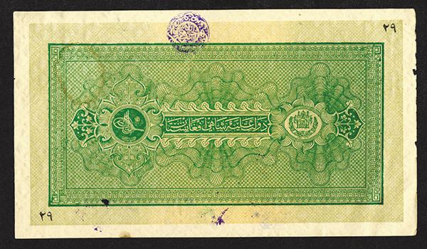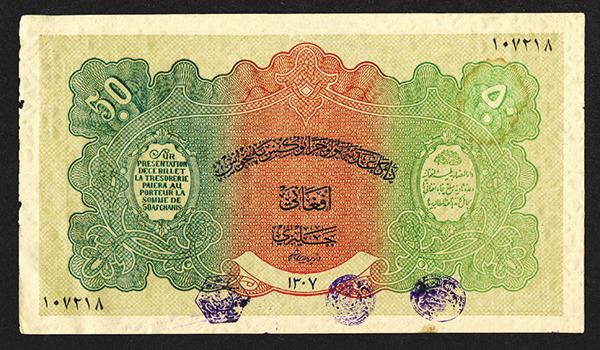 Afghanistan. 50 Afghanis. SCWPM 9. Large format. Tri-color print at center. With multiple square pattern watermark. Stain near top right and bottom margin, left end rough. With the expected hand stamps. Very Fine.