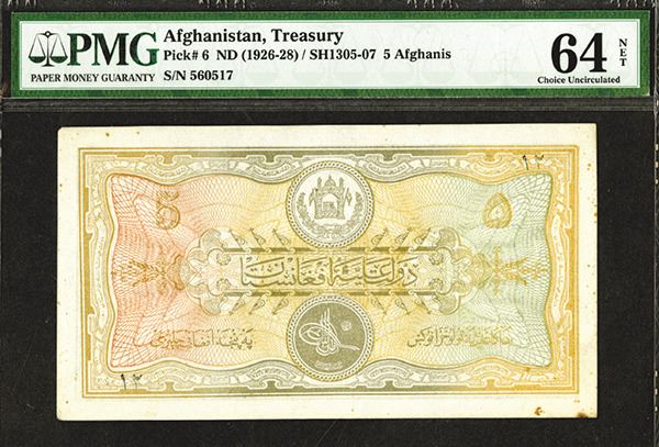 Afghanistan. 5 Afghanis. P-6. Arms at top center. PMG graded Choice Uncirculated 64 NET, rust notation.
