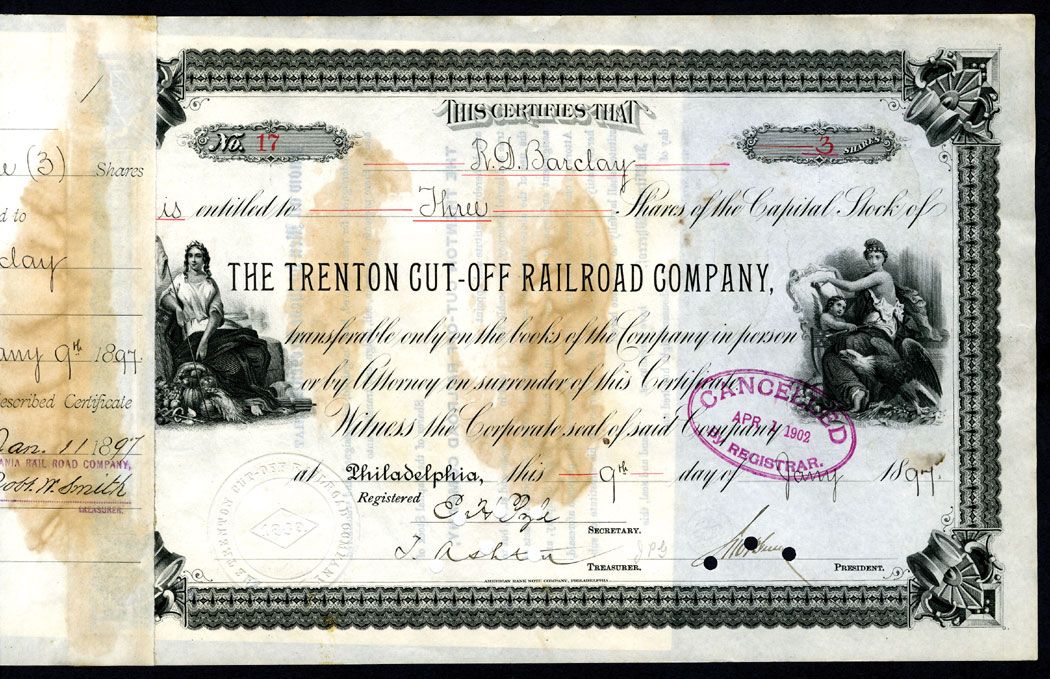 NJ, 1897, Cert. # 17, 3 Shares of Stock, Trenton Cut-Off Railroad Co., Issued and Cancelled Shares of Stock. PHC, Some Staining, VF