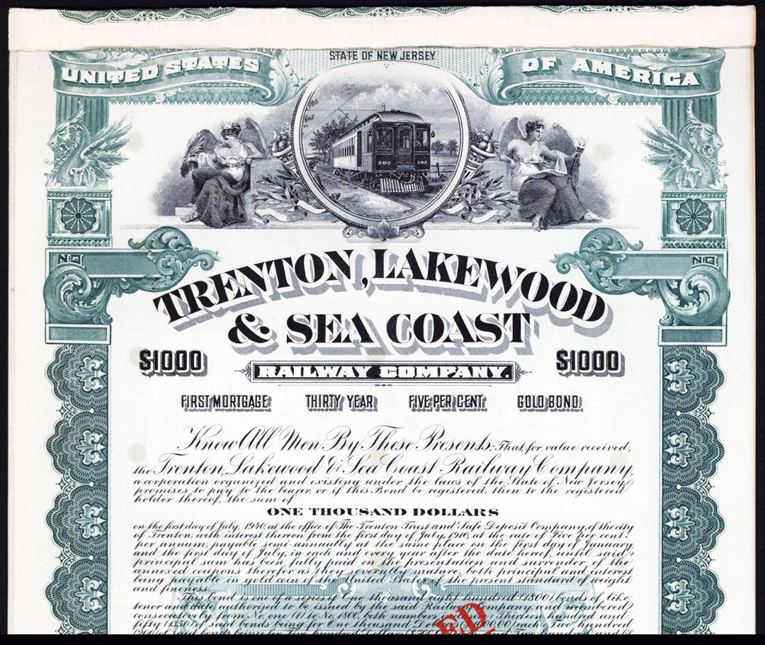 New Jersey. 1910. $1000. 1st Mortgage 5% Gold Bond. Green border. Allegorical angels flank interurban electric street car. XF condition. Red "Cancelled - Security Bank Note" overprint and POC's. Coupons attached. ABNC. Rare bond. 3 found in archive.