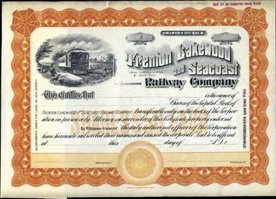New Jersey. ca.1890's-1910. Odd Shs. Specimen stock certificate. Red "Not to be removed from file" overprints and POC's. Orange border. Inter-urban street car with man and dog in foreground. VF condition with toning on top. Rare. SBNC.