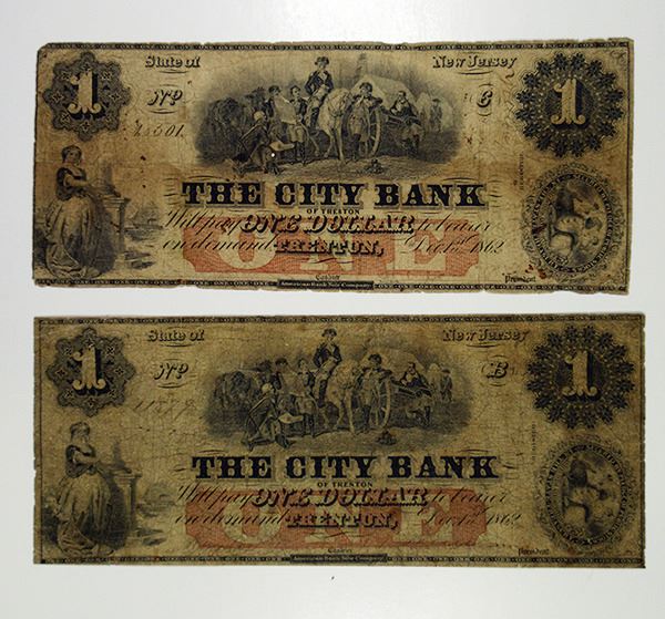 Trenton, NJ. Lot of 2 notes, Both are dated Dec.1, 1862, $1notes, Wait 2283, VG, and VG with Pin holes, R-6. The bank was incorporated in 1859 and closed in 1865. (2)