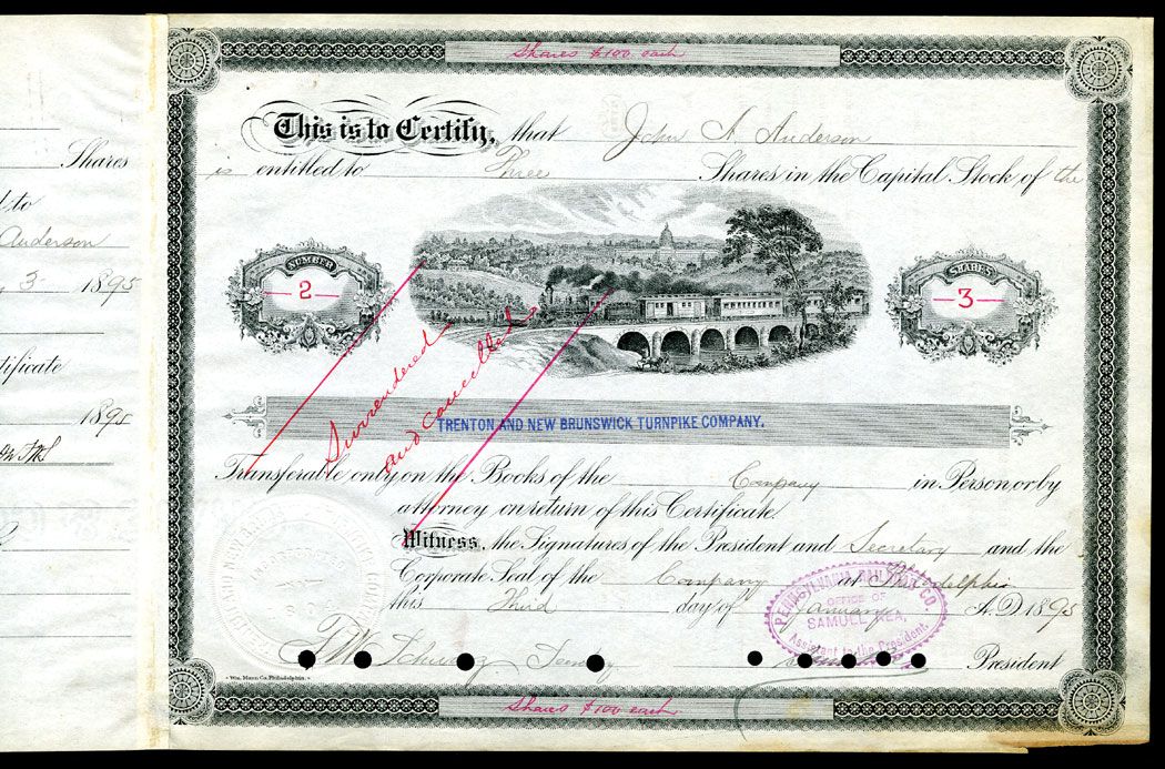NJ, 1895, Cert. #2, 3 Shares of issued and Cancelled Stock, Trenton and New Brunswick Turnpike Co., Signed by: Samuel Rea, Pres. Penn. RR., Punch Hole Cancelled, VF