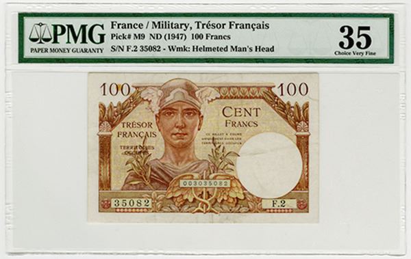 France. Issued 100 Francs, ND (1947), P-M9. PMG graded Choice Very Fine 35 with comment "Minor Stains" (Cert # 5003610-001).