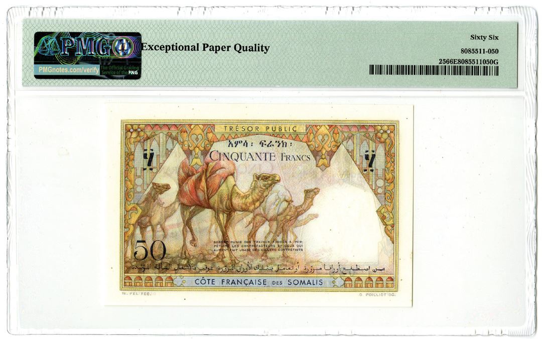 French Somaliland. ND (1952). 50 Francs - Djibouti, P-25, Light brown and multicolor, S/N N.96 026, Watermark: Woman's Head, PMG graded Gem Uncirculated 66 EPQ.
