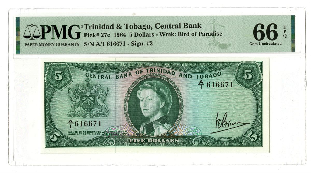Trinidad & Tobago, 1964. 5 Dollars, P-27c, Issued Banknote, Green on blue and red underprint with portrait of Queen Elizabeth II at center and arms at left, Back is green with building at center and logging scene in small circular frame at top right corner, S/N A/1 616671, PMG graded Gem Uncirculated 66 EPQ.