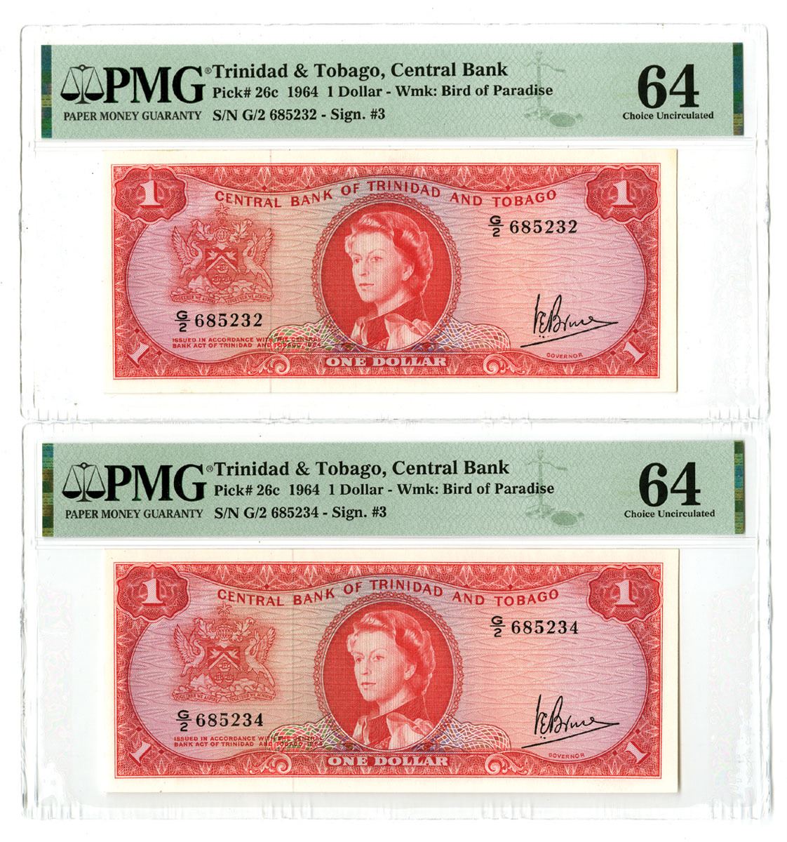 Trinidad & Tobago, 1964. 1 Dollar, P-26c (2), Sequential Issued Banknote Pair, Red on blue and m/c underprint with portrait of Queen Elizabeth II at center and arms at left, Back is red with building at center and oil rig in small circular frame at top right corner, S/Ns G/2 685232 & G/2 685233, PMG graded Choice Unc 64 and Gem Unc 66 EPQ. (2). Sold "AS IS" no returns accepted.