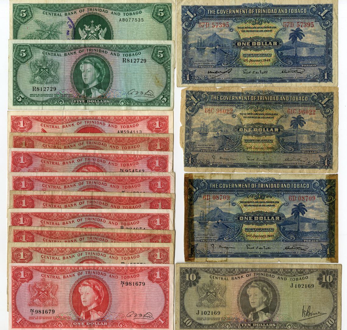 Trinidad & Tobago, 1939-64. Lot of 15 Issued Banknotes, Includes: Government of Trinidad and Tobago 1 Dollar, P-5b (2) and P-5c, 1935-39; Central Bank of Trinidad and Tobago 1 Dollar, P-26b (3) and P-26c (6), L.1964; 5 Dollars, P-27b and P-27c, L.1964; 10 Dollars, P-28c, L.1964. Notes range from Fine to Fine to VF condition. (15). Sold "AS IS" no returns accepted.
