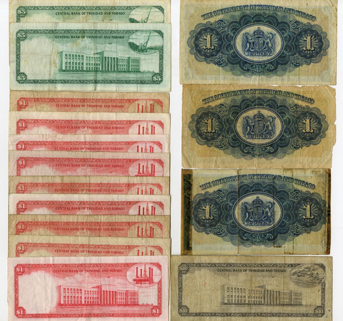 Trinidad & Tobago, 1939-64. Lot of 15 Issued Banknotes, Includes: Government of Trinidad and Tobago 1 Dollar, P-5b (2) and P-5c, 1935-39; Central Bank of Trinidad and Tobago 1 Dollar, P-26b (3) and P-26c (6), L.1964; 5 Dollars, P-27b and P-27c, L.1964; 10 Dollars, P-28c, L.1964. Notes range from Fine to Fine to VF condition. (15). Sold "AS IS" no returns accepted.