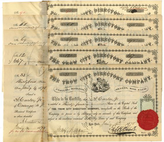 New York..., 18771-86. Lot of 5 I/C Capital Stock Certificates. Black on black border with cherub surrounded by books at top, Ink cancelled, Fine to VF condition with toning. (5). Sold "AS IS" no returns accepted. (ex. John E. Herzog Collection)
