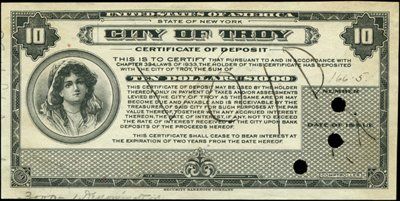 1933. P-Unlisted. $10. 1) $10, city of Troy Certificate of Deposit, Black. "Void" hand written on front. 2),3) Frames and vignette with no text, Purple and Black. Fine to UNC. SBNC.