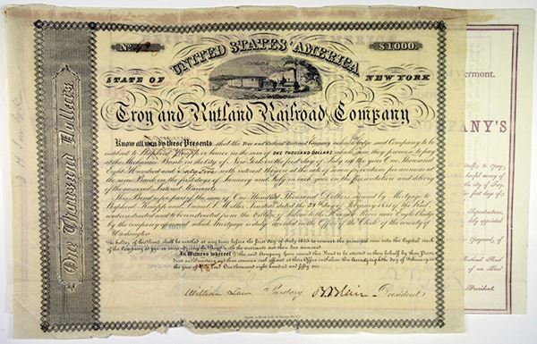 New York. Lot of 2 I/C bonds. First is an 1853 dated $1000 bond issued by Troy & Rutland Railroad Co., Fine with some rough edges; Second is an 1851 dated $1000 bond issued by Troy, Salem, & Rutland Rail Road Company signed by Jay Gould as one of the Trustees. The signature is complete and uncancelled and rarely seen this nice. Jason Gould, (May 27, 1836 _ December 2, 1892) was an American railroad magnate and financial speculator who is generally identified as one of the robber barons of the Gilded Age. His sharp and often unscrupulous business practices made him one of the wealthiest men of the late nineteenth century.