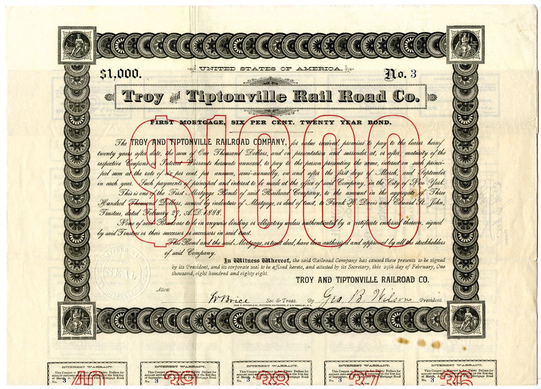 Tennessee, 1888. $1000 I/U 6% First Mortgage Coupon Bond, S/N 3, Black text with black border, Red underprint, Embossed company seal at bottom left corner. VF condition. Chas. F. Ketcham & Co., Stationers and Printers.