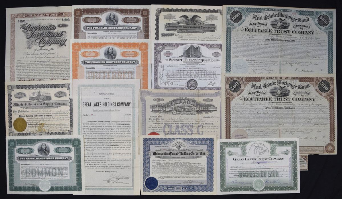 Various States........, ca. 1900-40s. Lot of 14 Mortgage, Trust, Loan and Building Finance Certificates and Bonds, representing investment companies, mortgage associations, building corporations, and trust entities. Includes examples from The Guarantee Investment Co.; The Franklin Mortgage Co.; Columbian Investment Co.; Stewart-Warner Corp.; Illinois Building and Supply Co.; Great Lakes Holdings Co.; Commercial Building & Loan Assn. of Baltimore; Metropolitan Temple Building Corp.; Great Lakes Trust Co.; and Real Estate Mortgage Bonds guaranteed by Equitable Trust Co. Conditions range from VF to XF with typical cancellations, folds, and light handling. (14). Sold ‘AS IS’ no returns accepted.
