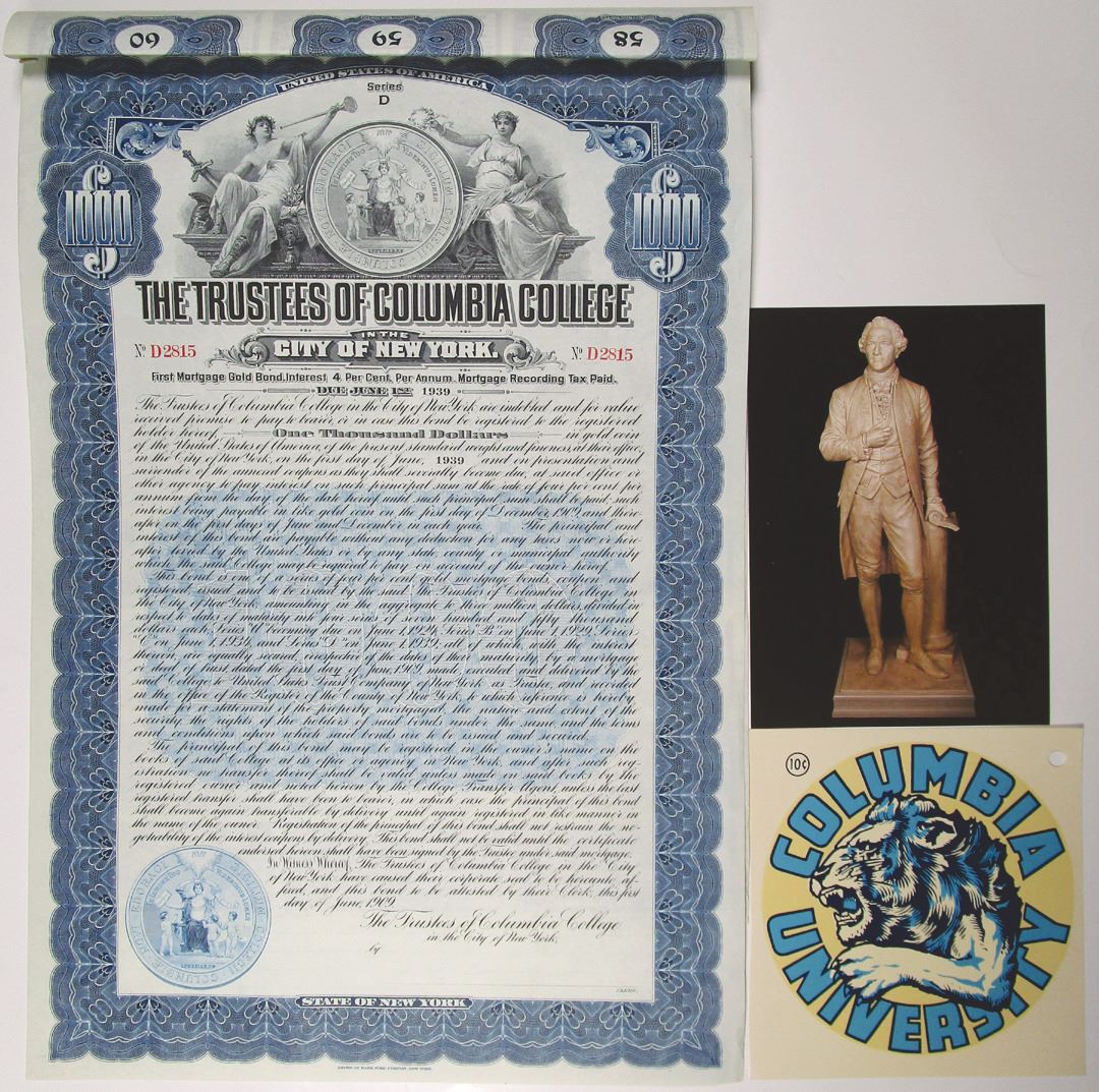 New York, Lot of 3 pieces, Includes: Trustees of Columbia College in the City of New York, 1909 $1000 U/U 4% First Mortgage Gold Coupon Bond in blue, VF condition; Also included is a 4.75 x 4.75 inch Columbia University decal, featuring Columbia's mascot, with application instructions on back; Third piece is a 4.25 x 6 inch Postcard featuring a photograph of a plaster statue of Alexander Hamilton, unused and in VF condition. Columbia University (also known as Columbia, and officially as Columbia University in the City of New York) is a private Ivy League research university in New York City. Established in 1754 on the grounds of Trinity Church in Manhattan, Columbia is the oldest institution of higher education in New York and the fifth-oldest institution of higher learning in the United States. It is one of nine colonial colleges founded prior to the Declaration of Independence, seven of which belong to the Ivy League. Columbia is ranked among the top universities in the world by major education publications. (John E. Herzog Collection) (3)