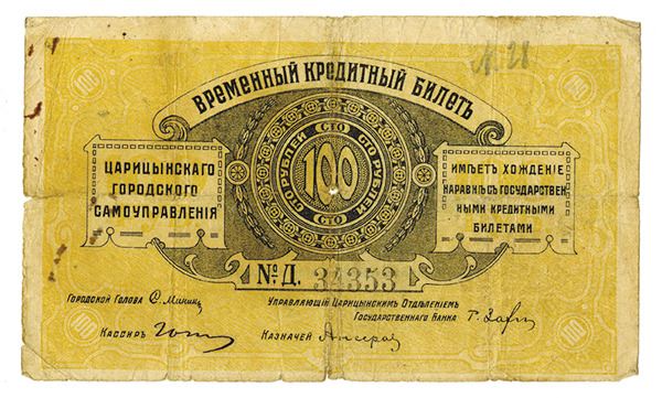 Russia - Southwest, issued 100 Rubles, local issue of the town of Tsaritsyn in the Volgograd region, not listed in the Standard Catalog, About Fine condition.