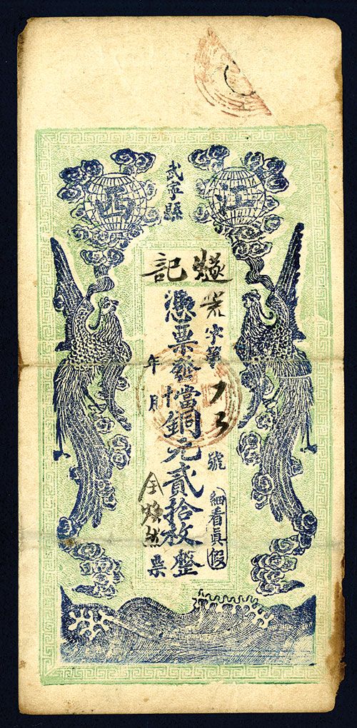 Face value 20 Pieces (200 copper coin). Private company printed cash certificate from Jiangxi Province, “Wu Ling Hsien” filled in by brush work, Company name “Tsui Kee”; On reverse, brushwork name of the cashed company. Dark blue with cockerels on the sides supporting globes on light blue underprint, back with Chinese character brush strokes. Choice VF condition.