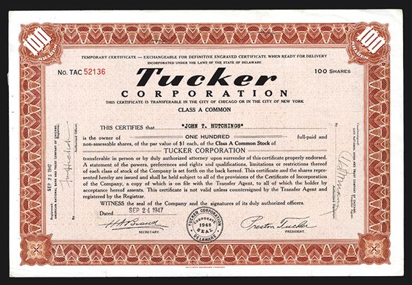 Delaware, 1947, I/U Stock, 100 Shares, #52136, no vignette, VF-XF condition, SBNC. Facsimile signature of company president Preston Tucker. Company was caught up in a stock trading scandal which led to its demise in the early 1950's.