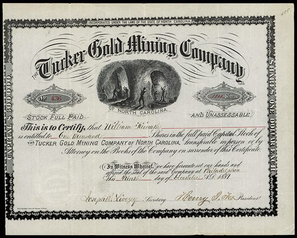 Tucker Gold Mining Company of North Carolina, 1881 Stock Certificate. North Carolina, 1000 Shares, I/U, miners working in mine, VF.